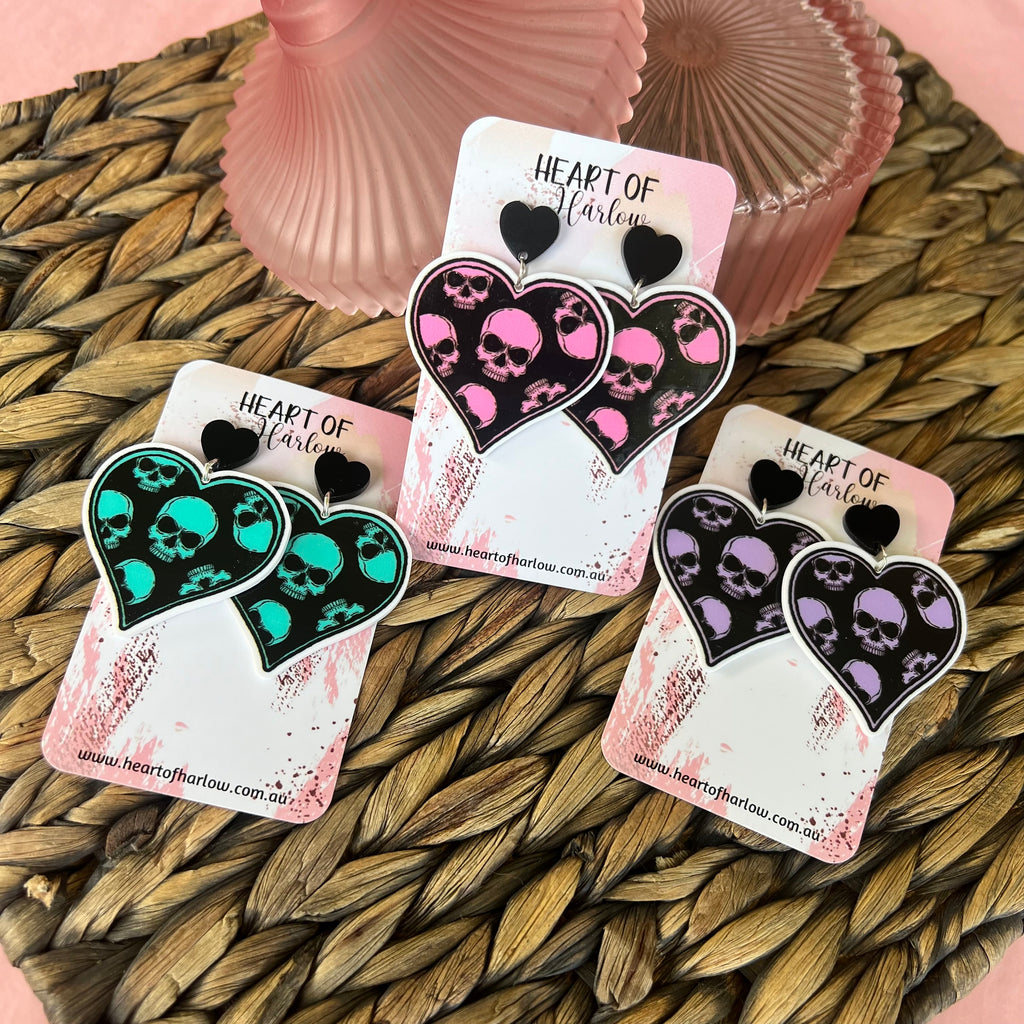 This listing is for one pair of Pink Skull Heart Dangle Earrings