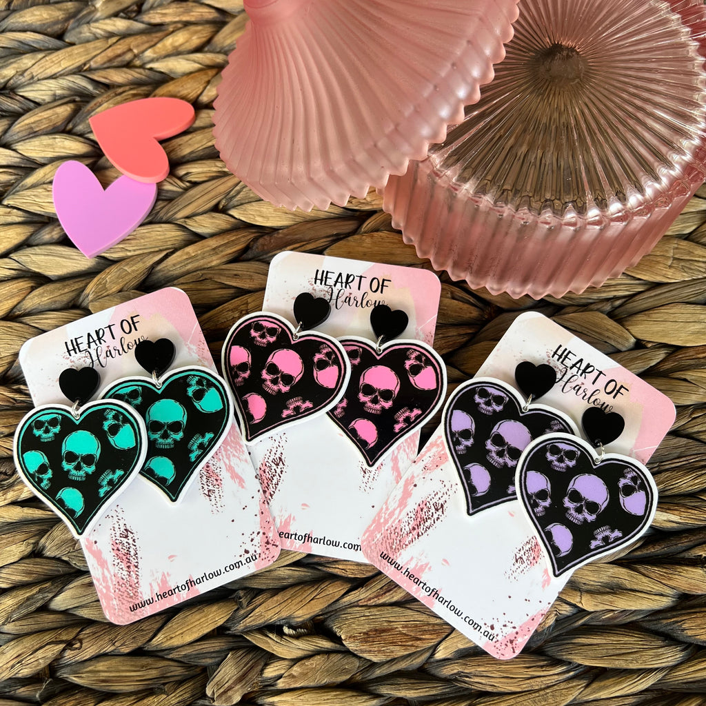 This listing is for one pair of Purple Skull Heart Dangle Earrings