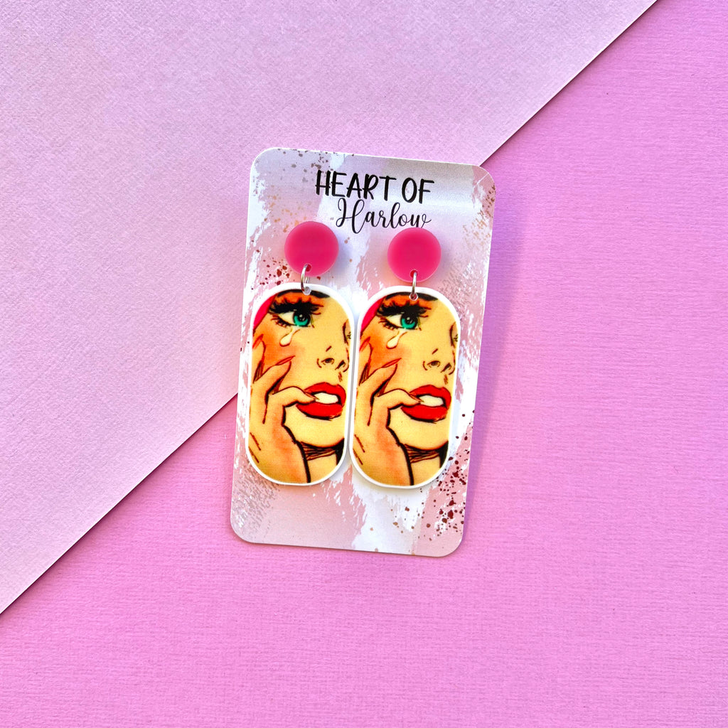 This listing is for one pair of Sad Gal Comic Dangle Earrings